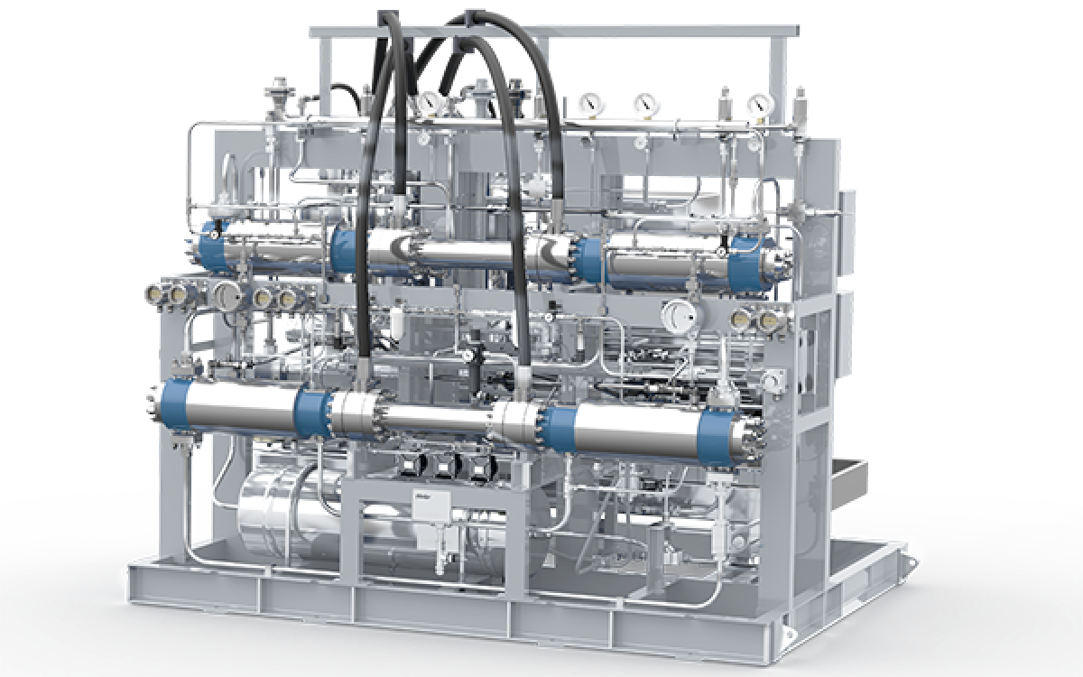 NEA|HOFER TKH hydraulic driven dry running reciprocating compressors come into play to transfer H2 from the storage through the dispenser into fuel cell tanks. They are the preferred option for intermittent operation like refueling processes at an HRS and can handle pressure levels of 350 and 700 bar.