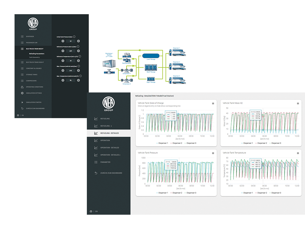 This optimization is supported by the NEA|HRS PILOT simulation software (picture right) which reflects H2 production, compressor data and the full fluid- and thermodynamical behavior of the HRS. Hydrogen coming from a NEA|HYTRON PEM electrolyzer needs to be stored under high pressure in storage vessels, e.g., trailers or onsite storage tanks.