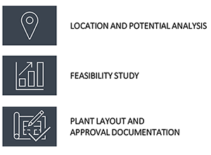 Expert consultants evaluate potential locations and support on judging the feasibility. Additionally, they deliver the design of the hydrogen production solutions from the selection of the right and site-specific system technology to the dimensioning of the components. Services also include the full governance of public approval processes.